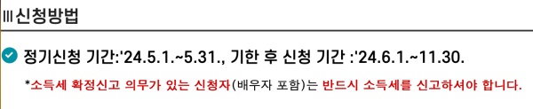 - 정기 신청: 2024년 5월 1일 ~ 5월 31일 (2023년 전체 소득분)