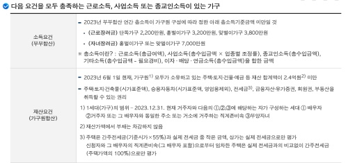 - 2023년 6월 1일 기준, 가구원의 재산 합계액이 2억 4천만원 미만이어야 합니다. 재산에는 주택, 토지, 건물, 예금 등이 포함되며, 부채는 차감되지 않습니다.